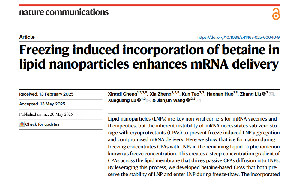 Cheng X, Zheng X, Tao K, et al. Durch Gefrieren induzierter Einbau von Betain in Lipidnanopartikel verbessert die mRNA-Übertragung. Nature Communications. 2025;16(1):4700.