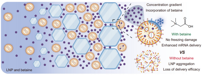 Das Forschungsteam entwickelte ein zusammengesetztes Kryoprotektivum (BT-CPA) aus Betain und Trehalose. In einer Reihe von Experimenten wiesen sie nach, dass das Einfrieren die aktive Einlagerung von BT-CPA in Lipidnanopartikel (LNPs) bewirkt und dadurch zwei wichtige Effekte erzielt: (1) Erhalt der strukturellen Integrität der LNPs nach Gefrier-Auftau-Zyklen und (2) Verbesserung der Fähigkeit der LNPs, aus Endosomen freigesetzt zu werden, wodurch die Effizienz der mRNA-Übertragung gesteigert wird.