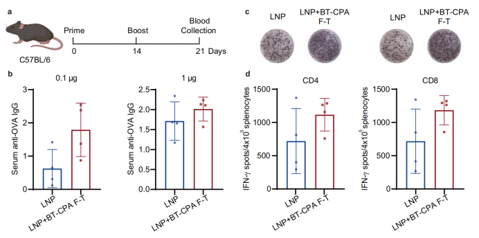 • Stärkere Immunantwort: BT-CPA-LNPs, die Ovalbumin-mRNA (mOVA) einkapseln, induzierten bei Dosen von 0,1 μg und 1 μg signifikant höhere OVA-spezifische IgG-Antikörpertiter, und ELISpot-Assays zeigten eine Zunahme von IFN-γ-positiven CD4⁺- und CD8⁺-T-Zellen.