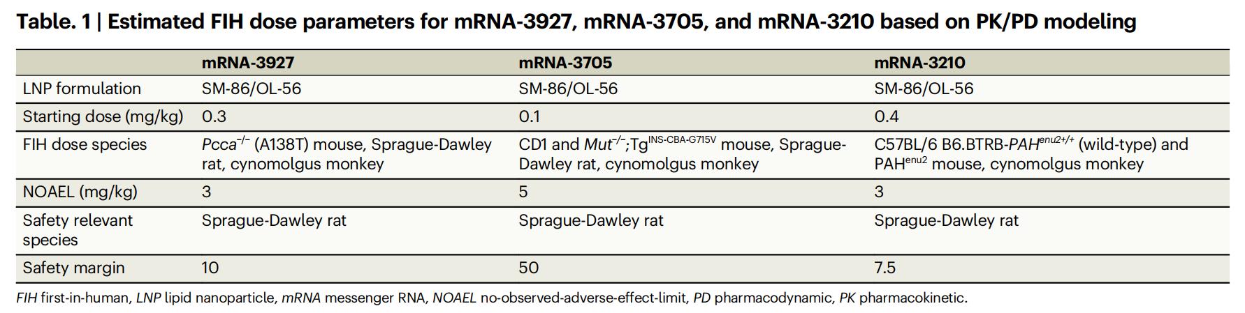 Table 1: Estimated FIH Dose Parameters for mRNA-3927, mRNA-3705, and mRNA-3210 Based on PK/PD Modeling