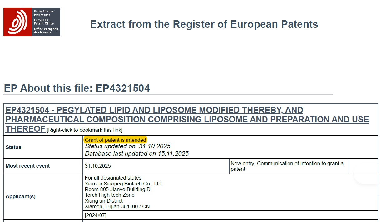 SINOPEG's mPEG-DTA-1 and HO-PEG-DTA-5 Granted European Patents, Domestically Developed High-End LNP Excipients Gain International Recognition November 21,2025.